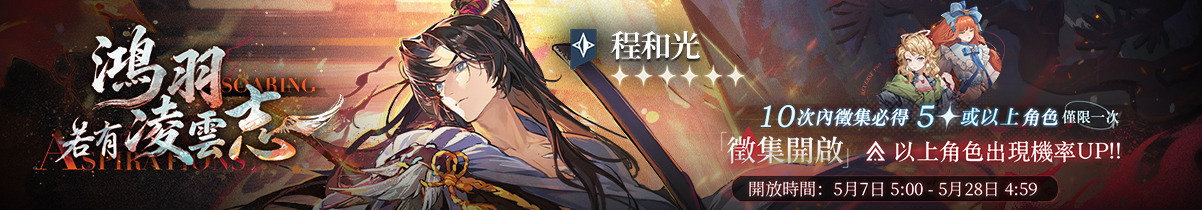 【徵集說明】活動期間內,6星角色「程和光(星)」以及5星角色「嬰兒藍(星)」、「金蜜兒(星)」的受邀機率將大幅提升。